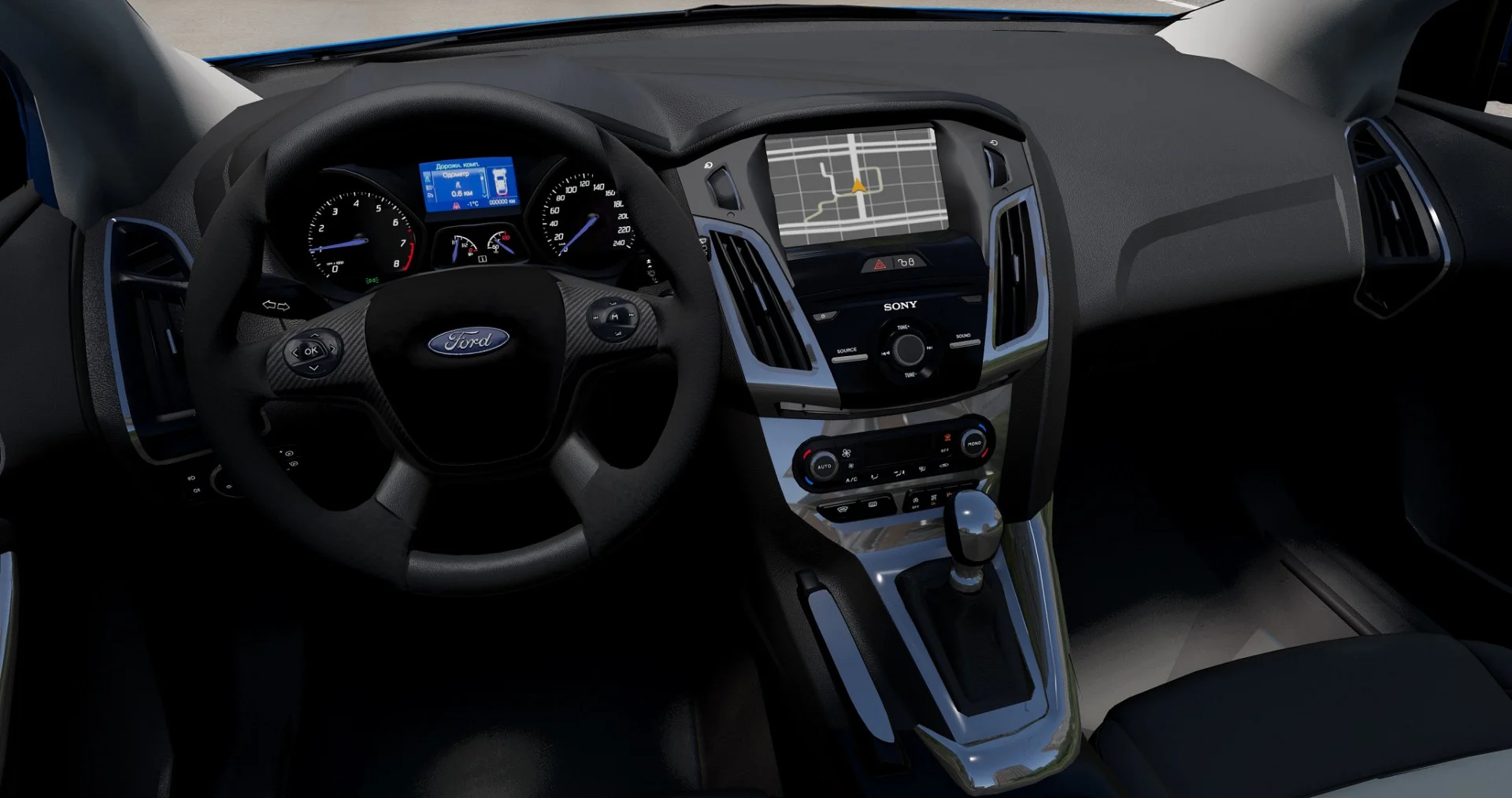 - Анимированная приборная панель, педали, рычаг передач, ручник;