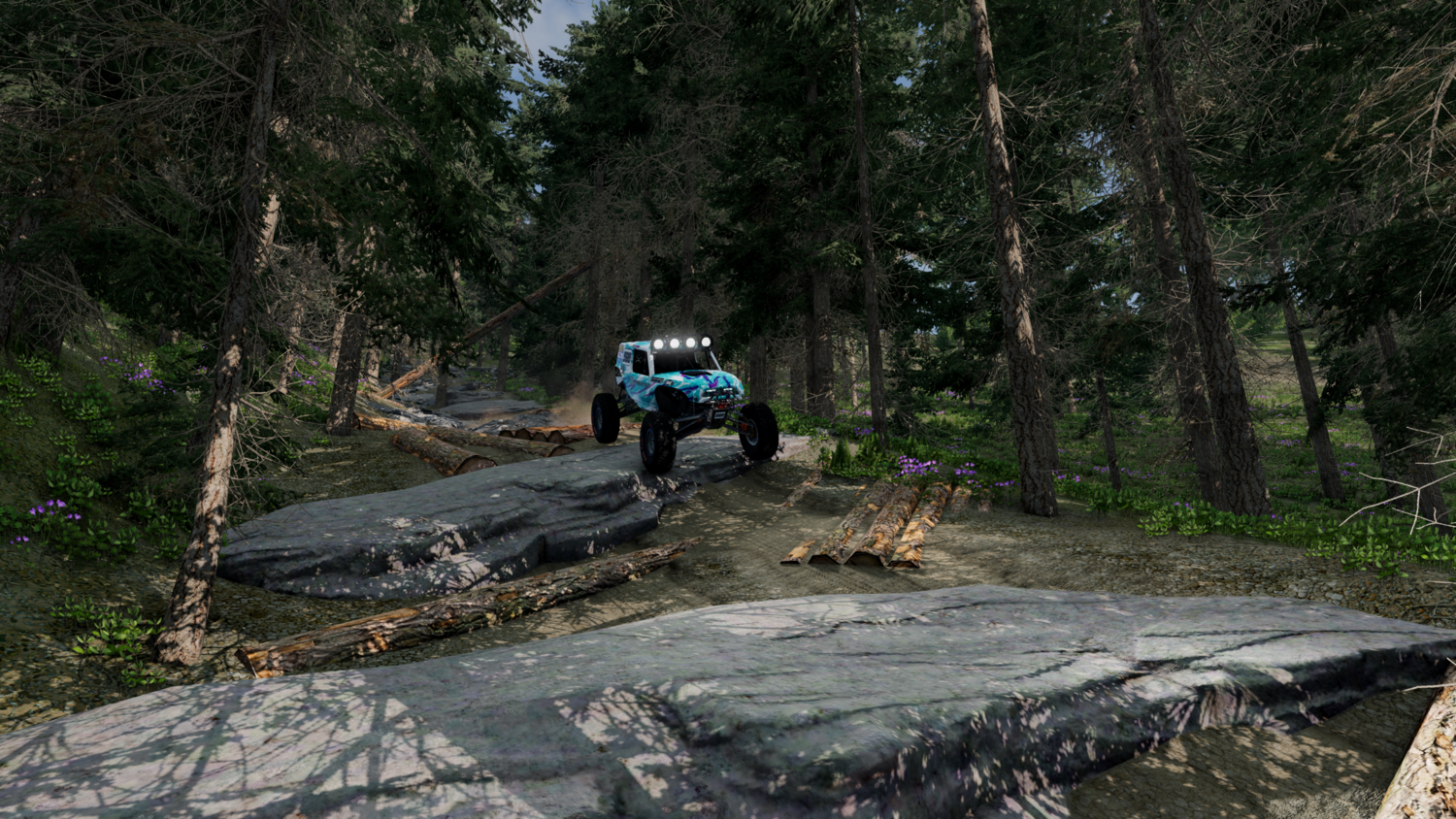 На карте есть как скоростные участки, так и достаточно сложные с камнями, деревьями и бревнами. Мощный, проходимый внедорожник обязателен!