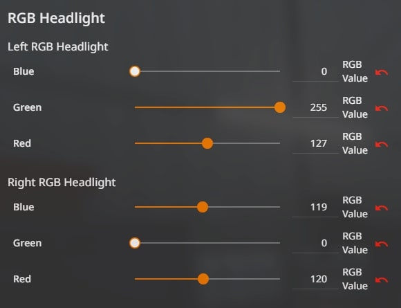 Вы можете изменить цвет фар, используя цветовой код RGB (красный, зеленый, синий).